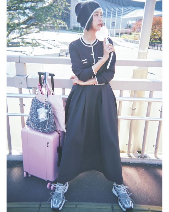 カーディガン¥5,980(オペーク ドット クリップ)スカート¥53,900 (セオリー/リンク・セオリー・ジャパン)ニット帽¥8,580 (ザ シンゾーン/シンゾーン ルミネ有楽町店)バッグ¥108,900(アンテプリマ/ワイヤーバッグ/アンテプリマジャパン)キャリーバッグ¥121,000(フロイド/ビーズインターナショナル)(※車輪は別売り セットで¥11,000)ソックス¥990(靴下屋/タビオ)スニーカー¥13,900(チャールズ&キース/チャールズ&キース ジャパン)