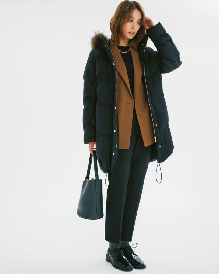 厳しい寒さが続く今日、カジュアルムードがあるダウンジャケットを通勤で活用するなら、ミドル丈を選んで上品に昇華すればオフィスでも対応します。さらにジャケットを中に仕込んで重ね着のひと手間を加えれば、キリッと真面目な雰囲気に。ボリューミィなディテールだからこそ、ボトムスやインナー、小物を黒でまとめてスマートに引き締めるとうまくいきます。