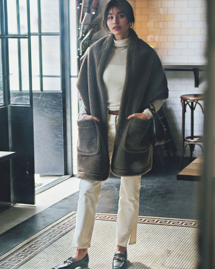 パンツスタイルやレザーアイテムがワードローブ1軍の辛口派は、キリッとハンサムな雰囲気ですが細部にほんのり甘さを感じさせると今っぽい仕上がりに。愛嬌たっぷりのボアストールをコーデの主役にすれば、尖って見えず優し気な印象に刷新します。トップスやボトムスはオールホワイトにまとめて、エレガントさとIラインを強調して。