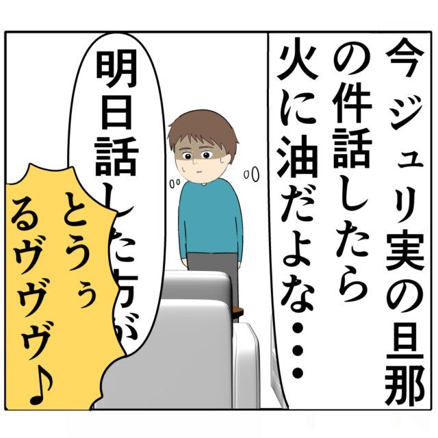 めいさんの怒りをひしひしと感じて「今ジュリ実の旦那の件を話したら火に油だよな・・・明日話した方が」とろみ緒さんが考えていたその時、ろみ緒さんのスマホが鳴りました。