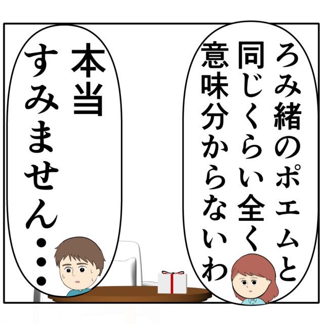 「ろみ緒のポエムと同じくらい全く意味分からないわ」と正論をつきつけるめいさんに「本当すみません・・・」と平謝りのろみ緒さん。