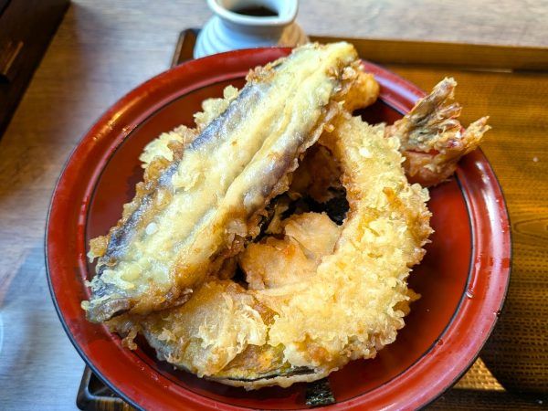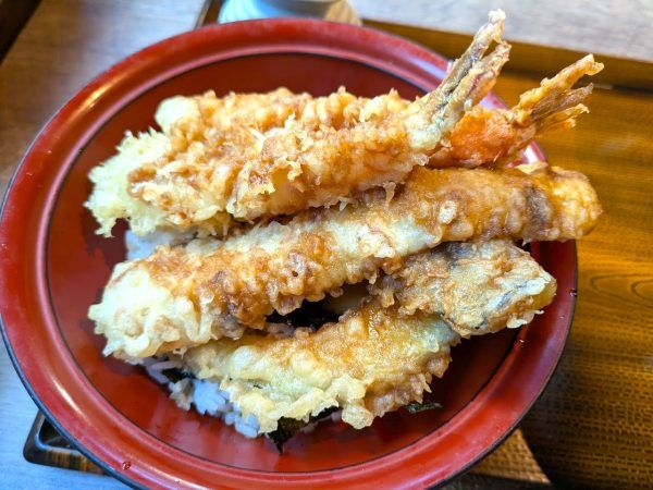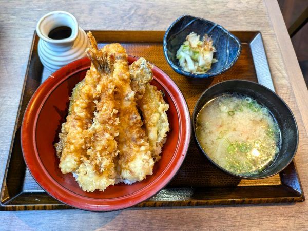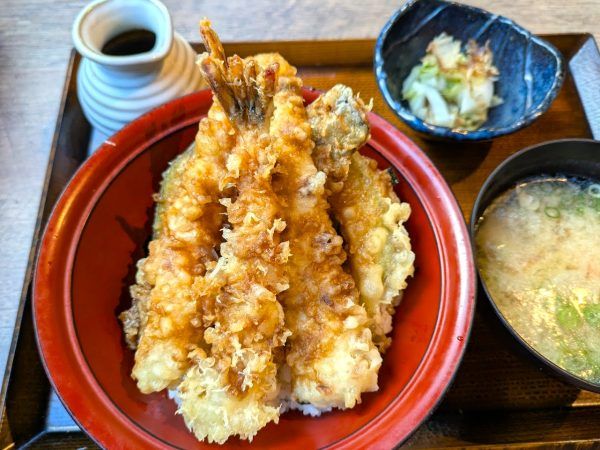 名物「天丼」は海老天2尾、ちくわ天・なす天・かぼちゃ天に鶏天も!