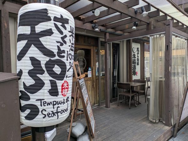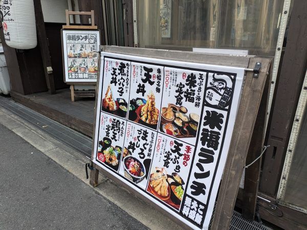 御堂筋から伏見町3丁目の交差点を東に3筋目の角にあるテラス席が目印のお店です。ビジネス街にテラス席って目立ちますよね~。「米油100% さくっと天ぷら」の提灯も目を引きますね~。米油ってカラダに良いって聞きますよね~。