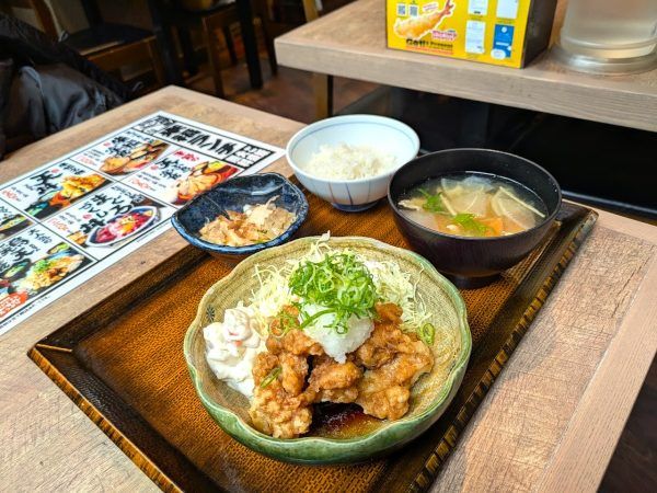 鶏天皿には、たっぷりのキャベツとポテトサラダです。大根おろしに青ネギが乗ってます。鶏天がゴロゴロとはいっていて、鶏天の下には自慢の甘ダレがたまっています。この甘ダレと鶏天とご飯がめっちゃ合います。サクサク感の天ぷらと鶏肉のジューシーさでパクパクとご飯がすすみます。おいしいです。