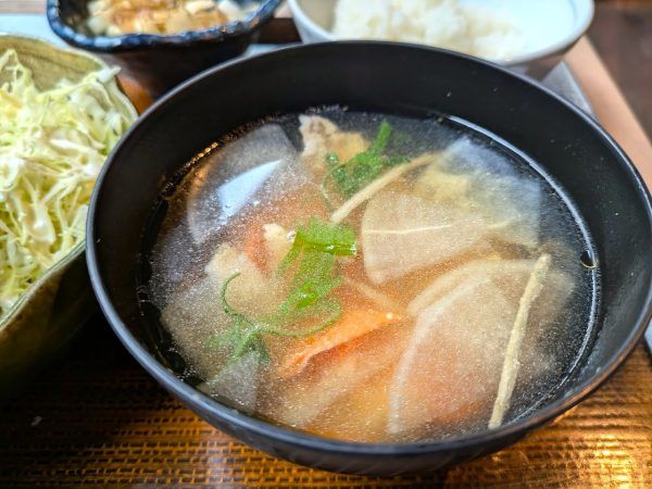 豚汁も具だくさんで、大根・人参・牛蒡・豚肉の入ったやさしい味わいのお汁でした。米油は天然栄養成分が非常に豊富で、健康維持を促す成分は食用油の中でも豊富だそうです。食べて健康生活を維持しようとしているるなるなにはもってこいですね。(笑)