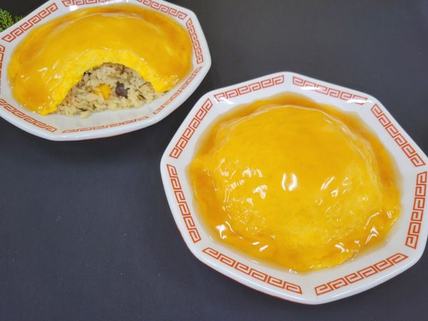 チャーシュー入り炒飯が、厚みのあるふんわりとした食感のたまごで優しく覆われています。醤油ベースのホタテのうまみが溶け込んだ餡が炒飯とたまごを包み込み、飽きの来ない味わいに。