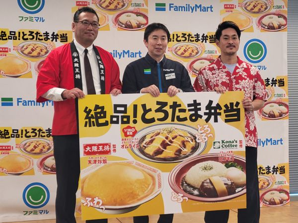 登壇した、ファミリーマートの木内智朗さん、イートアンドフーズの長船隆行さん、KONA'Sの阿部和剛さん。それぞれが太鼓判を押す自信作になっているとろたま弁当。