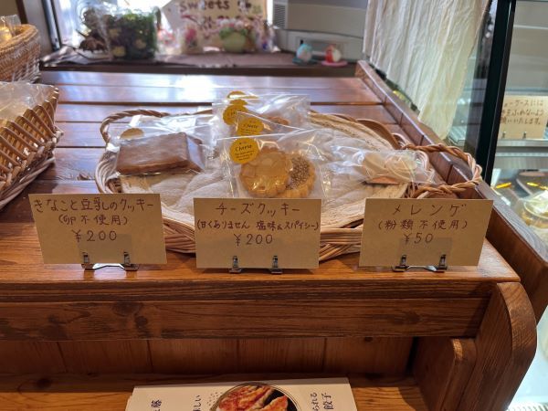 左からきなこと豆乳のクッキー(200円)、チーズクッキー(200円)、メレンゲ(50円)、卵不使用や甘くありませんなど小さな説明書きはありがたいですね!