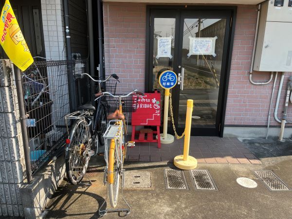 赤い看板の前が駐輪場です。自転車で来られた方は必ずこちらのスペースに停めてくださいね。 駐車場もありませんので車で来られた方は近くのコインパーキングなどに停めてくださいね。
