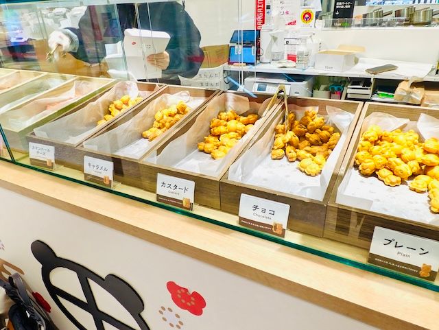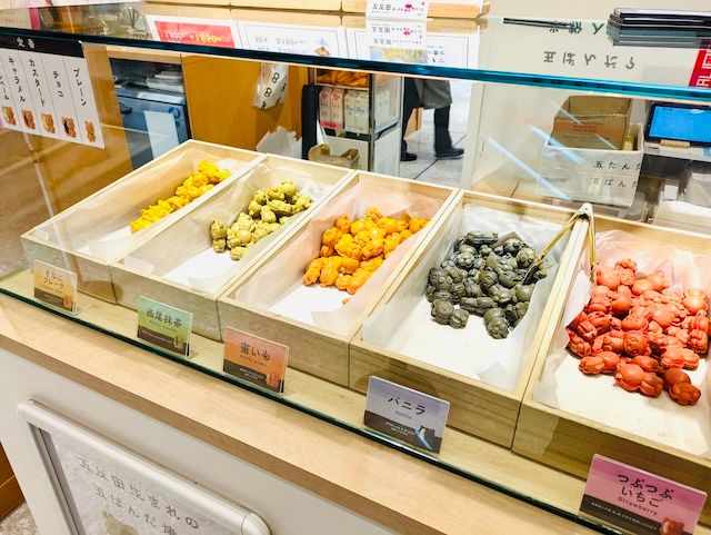お店のケースには、鮮やかな色合いのパンダたち。カラフル生地の5種類の五ぱんだ焼き(つぶつぶいちご、バニラ蜜いも、西尾抹茶、きなこフレーク)と、色のついていない5つの味の定番パンダ焼き(プレーン、チョコ、カスタード、キャラメル、カマンベールチーズ)の、10種類がラインナップしていました。フレーバーは、季節によって変わるので、SNSも要チェックです。