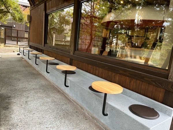 店内の柱には、一昨年、改修により引退した一の鳥居の一部が再利用されているんです。70年間がんばってきた鳥居の、しっとりとした朱色が内装にマッチしていますね。