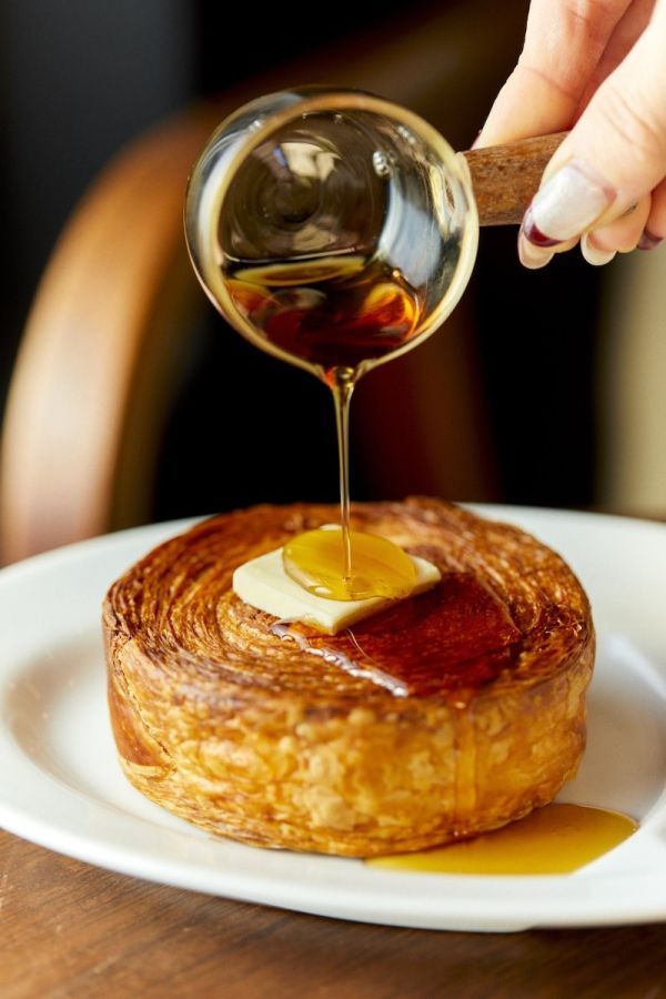 カフェタイムでは、プレーンなクロワッサンにバターとメープルシロップを添えたシンプルなメニューが人気だそう。「プレーンクロワッサン」330円(店内340円)とブラウニーを混ぜ込んだ「ブラウニークロワッサン」370円(店内380円)は持ち帰りもOK。
