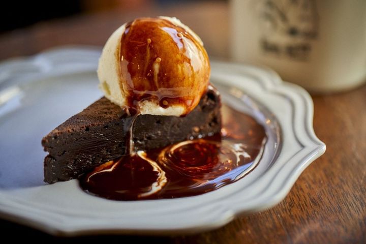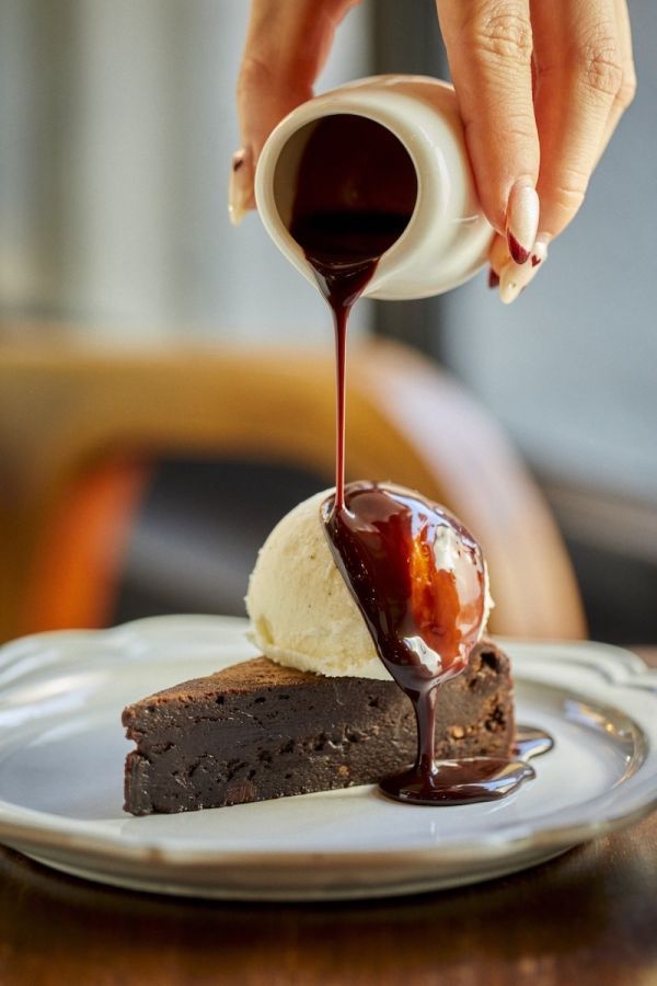 さらに“生ブラウニー”の上のアイスに、別添えの温かいチョコレートソースをとろり垂らします。このチョコレートソースからはカカオ豆のフレッシュさがあり、“生ブラウニー”にさわやかさを添えます。