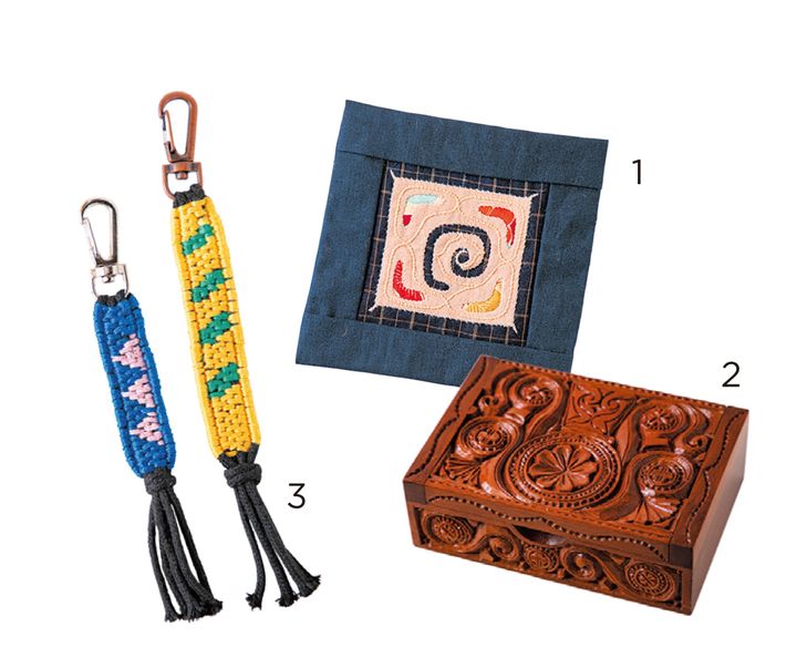 1、絶妙な色合いのアイヌ刺繍コースター(¥1,600)。2、木彫り歴70年の木工作家・小林洋さんの木箱(¥8,000)。繊細な木彫りに目を奪われる。3、アイヌの刀掛けを作る時の編み方「エムシアッ織」を取り入れたストラップ(各¥1,350)。モダン。