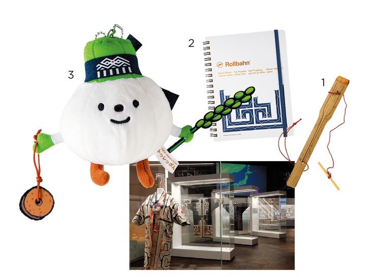 1、アイヌ民族の伝統楽器「ムックリ」(¥1,300)。鈴木紀美代さんが手がけたもの。2、『デルフォニックス』の定番ノート「ロルバーン」に、マンタリ(前掛け)のアイヌ文様を落とし込んだ(¥900)。3、PRキャラクターであるトゥレッポんのボールチェーンマスコット(¥950)。提供:公益財団法人アイヌ民族文化財団