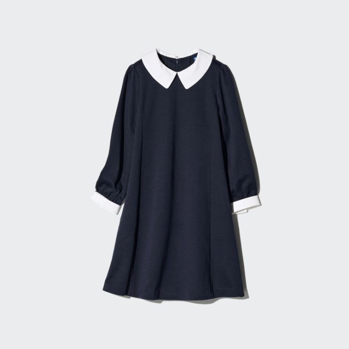 女の子には襟と袖がホワイトの清楚なワンピースを!ネイビーだけでの展開ですが、襟と袖のバイカラー、裾にかけて少し広がる流行りのシルエットが素敵♡ジャケット、パンツ、ワンピースは、どれも柔らかなジャージー素材。これならフォーマルすぎず、普段着としても重宝しますよね。自宅で簡単に手入れできて、型崩れもしづらいのでヘビロテできちゃいます!