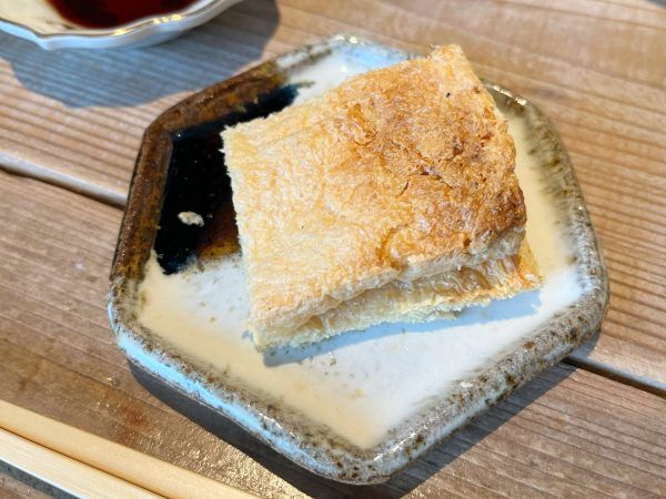 メニューはたくさんありますが、素材の味を活かしたものが多い気がしました。例えば、「名物!きつね焼き」は、福岡の名店「三原豆腐店」の油揚げを天火でサクッと香ばしく焼いたもの。(825円)シンプルにしょうが醤油でいただきます。