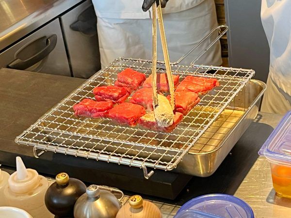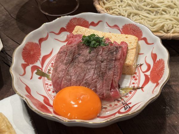 尾崎牛を炭火で軽く焼いて、卵黄と、グルテンフリーの泡醤油と混ぜていただく「尾崎牛のもも肉炙りユッケ」。