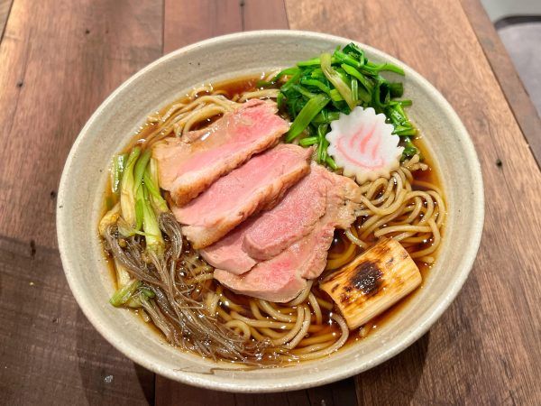濃いめのスープが印象的な「鴨芹そば」(3,025円)は、鴨の甘めの脂と、芹のほのかな苦味が染みる一品。