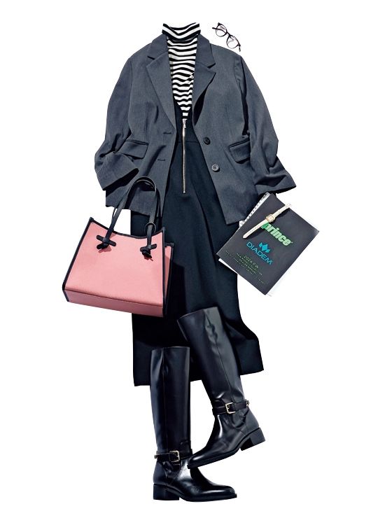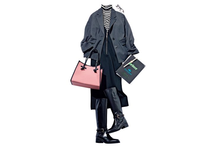 ジャケット¥37,400/カデュネ ジャンスカセット(ジャンスカ)¥15,994/NATURAL BEAUTY BASIC ボーダータートル¥4,389/ロペピクニック(ジュン) ショルダーバッグ¥37,400/ジャンニ キアリーニ(ジャンニキアリーニ 銀座店) ロングブーツ¥39,600/ダイアナ(ダイアナ 銀座本店) メガネ¥12,000/OWNDAYS 時計¥17,600/クルース