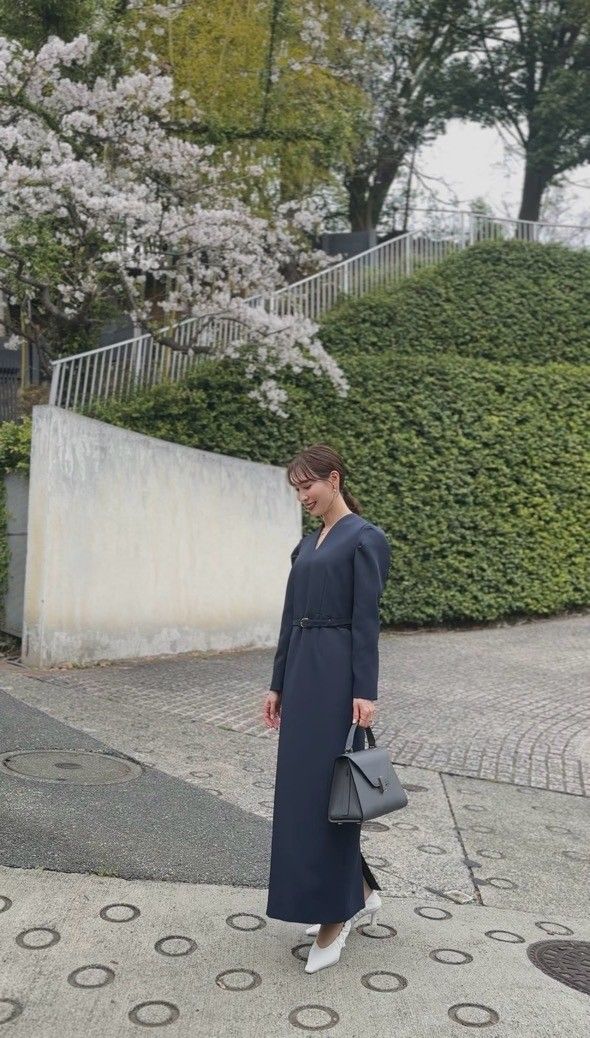 「初対面の方ばかりの入学式にはきちんと感がありつつ、どこかにひと癖あるデザインの服を探していました。上下揃えると大変なので、一枚でサマになる襟元のカッティングとパワショルが気に入ったワンピースを新調。靴は白にして明るさをプラスしました。まわりも黒紺コーデのママが多かったのですが、後日『入学式で着ていたワンピース可愛かったですね、どこのですか?』と声をかけてくれたママもいて、浮かずに自分らしさを出せてよかったです」小田原絵里奈さん/38歳・164㎝(7歳の女の子ママ)