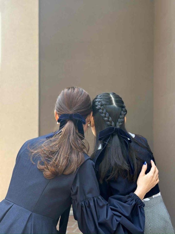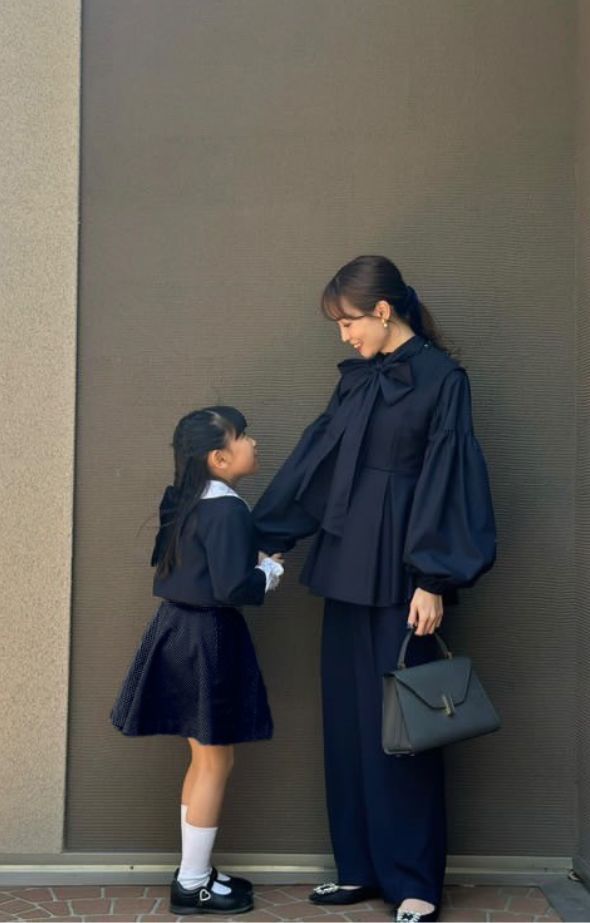 「園の雰囲気から卒園式はネイビーコーデにすると決めていて、動きやすさと防寒を考えてパンツスタイルに。合わせはワントーンなので華やかさの出るボウタイブラウスにし、パンツも同じブランドで揃えてセットアップ風にしました。上にブレザーを羽織るか迷いましたが、式典中は暖房がきいていると先輩ママから聞いていたので手持ちのペプラムジレをレイヤード。娘とお揃いのLa merのベロアリボンを付けたのもいい思い出です」