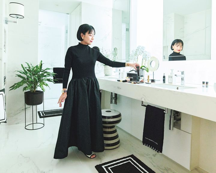洗面台の生活雑貨やインテリアは自身のブランドで統一。バスマットとタオルもTHE WEEKEND HOTEL。その時使う美容アイテムだけを洗面台に出し、使ったらすぐ元の収納に戻します。ゴミ箱やティッシュなど生活感に繫がるものはビルトインで常に美しい視界をキープ。床の雑巾がけも毎日します。美の原点となる環境を正していると、自然と美意識が高まり、表情や仕草もよい雰囲気に。心地よく美容に向き合うことで、美の好循環が生まれています。