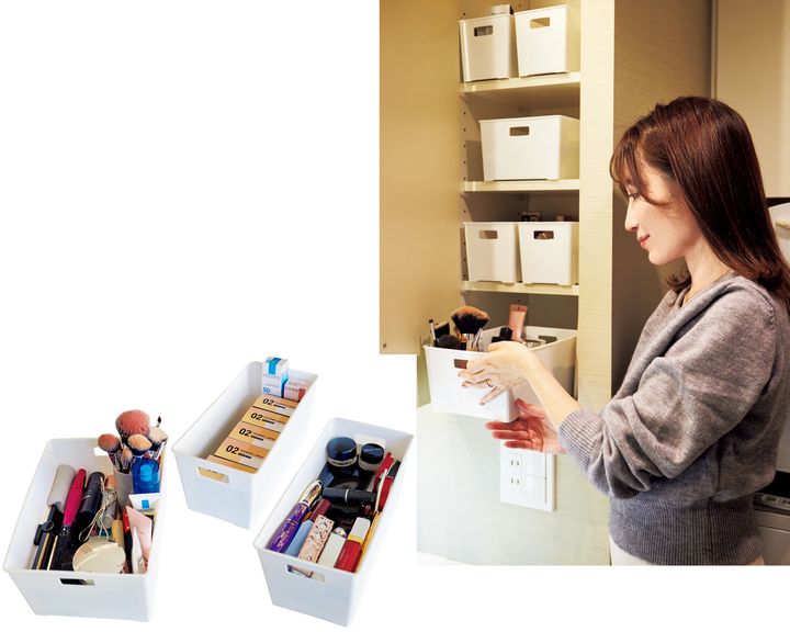 使用頻度が高い順に、下段からボックスを置くのがルール。見やすい&取り出しやすい一番下の棚に1軍ボックス、その上が2軍と上にいくほど普段使わないストックや未開封のものを収納。