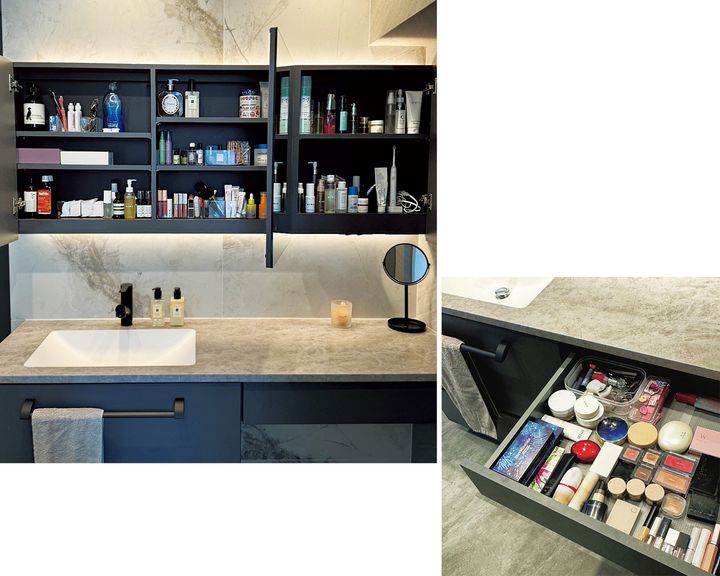左:今年7月に自宅を新築。鏡裏は広い収納棚。リップやブラシは100均のケースに。WELEDA、Aēsop もこちらに収納。右:メイクアイテムはカテゴリー別・使う順に左から右へ引出しに収納。UTOWA のチーク&アイカラーは色がお気に入り。