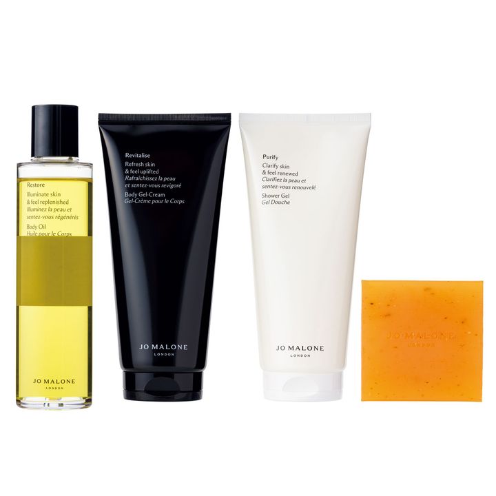 左から/イルミネート ボディオイル 150㎖ 16,280円、リフレッシュ ボディ ジェル クリーム 200㎖ 8,360円、ピュリファイ シャワー ジェル 200㎖ 5,940円、リフレッシュ エクスフォリエイティング ソープ 100g 3,630円(ジョー マローン ロンドン TEL:0570-003-770)