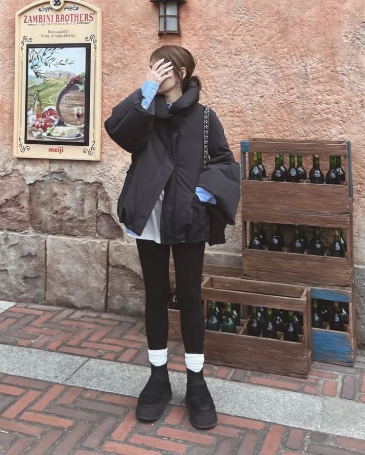 ダウンやスキニー、ブーツを黒で統一し、重くなりすぎないようブルーカラーのシャツや白ソックスをアクセントとして取り入れているのがおしゃれですね♡