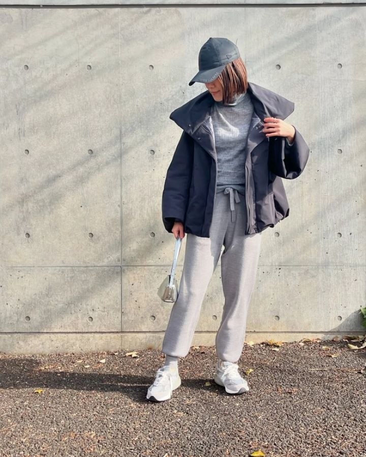 ハイブリッドダウンジャケット×スウェットパンツ×キャップでカジュアルダウン