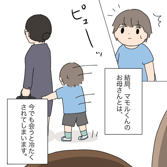 そしてマモル君ママの後ろを急いでついて行くマモル君の姿が。結局、マモル君のママとはあれから平行線。あかねさんは、今でも会うと冷たくされてしまうのでした。