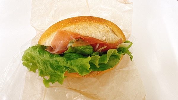 フランスぱん・生ハムサンド(320円)は、お店の方から少し温めて食べると、ぱんがやわらかくなって美味しいと教えていただきました。噛み応えのあるしっかりとしたぱん生地に生ハムの塩気とレタスが合う!