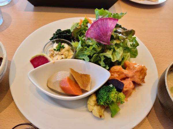 副菜のホウレン草&春菊も甘くて美味しい! ドレッシングも手作りで、胡麻和えも丁寧に胡麻が摺られていて、あまりの美味しさにお代わりしたかったほど(笑)。