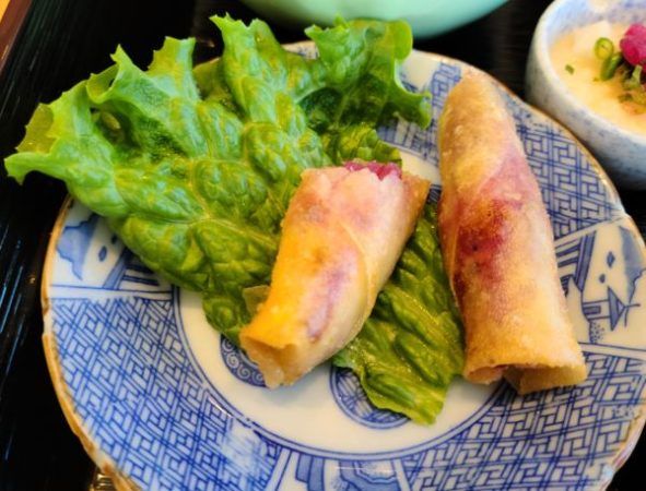 赤大根とハムとチーズの春巻きです。赤大根はあまり食べたことないのですが、すごく美味しい! ハムとチーズとマッチしていて、相性抜群です。赤大根の赤色が鮮やかです。