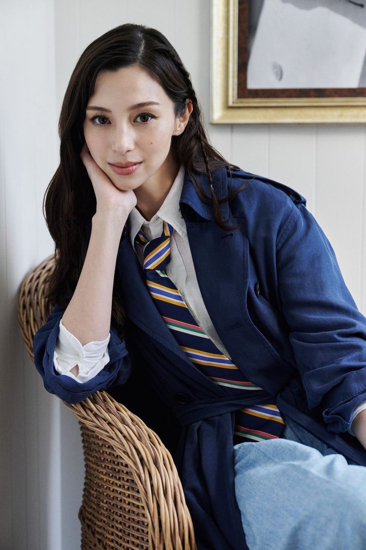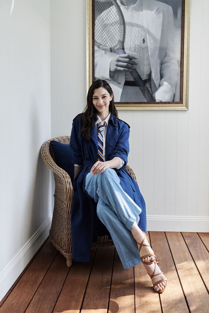 鮮やかなブルーのトレンチコートにライトブルーのデニムパンツを合わせた中条あやみ。ポロ ラルフローレンならではのビビッドなカラーリングが冴えるストライプタイをアクセントにして、マニッシュなテニス観戦ルックに仕上げていたのが印象的。
