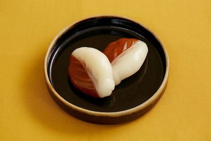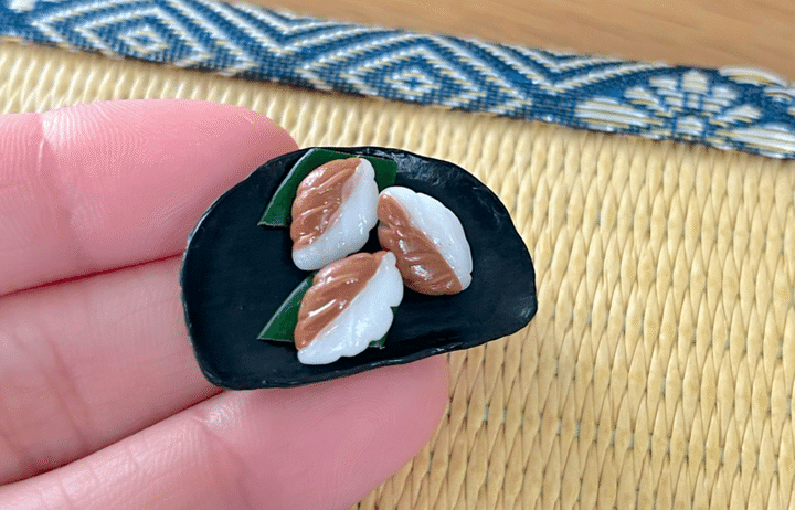 丸や葉のかたちなど様々ですが、わたしのイメージするかたちはこの葉っぱ型です。黒糖の優しい甘さと程よい弾力が好きで、帰省時に見かけるとつい手に取ってしまいます。お餅に照りを出すことであの独特の弾力を表現しました。
