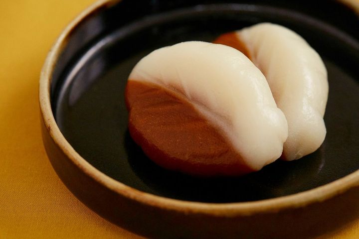 上新粉と砂糖を混ぜ合わせた生地のかたちを整え、蒸してつくります。白色の生地は白砂糖、黒色の生地は黒砂糖を混ぜ合わせてつくります。よもぎを入れて緑色の生地をつくる場合もあります。