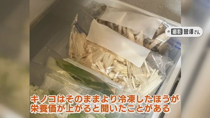 曾澤さん:「キノコはそのままより冷凍した方が、栄養価が上がると聞いたことがあるので、なるべく冷凍したキノコから食べるようにしています」