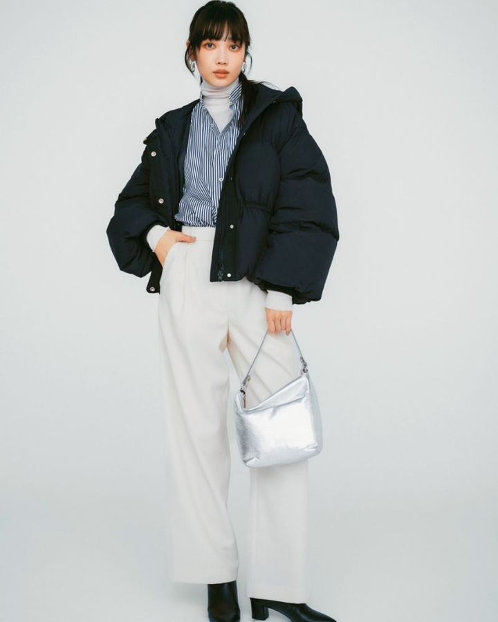 1月29日(水)、この時季重宝したいダウンジャケットですが、カジュアルさゆえに通勤で浮いてしまう可能性も…。そんな時はマットな黒を選んでフォーマルさを意識すると、オフィス街になじみます。さらに綱ぎ目の少ないデザインなら、ジャケットのような洗練度に。「シャツ×タートルニット」の定番合わせも違和感なく見違えます。上半身がボリューミィなぶん、ボトムスは落ち感のあるワイドパンツでスタイリッシュに着こなして。