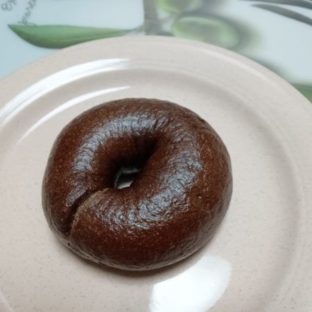 チョコ系4個のひとつ、チョコチップ入りのココアチョコベーグルです。いい色に焼かれていますよね‼ココアとチョコという定番中の定番のチョコ系ベーグルではないでしょうか…
