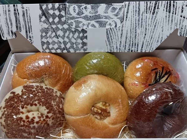 薄緑色で目立っているのが抹茶ホワイトチョコベーグル。名前の通り抹茶とホワイトチョコが使われているわけですが、他のベーグルよりも上品な味わいだと感じました。