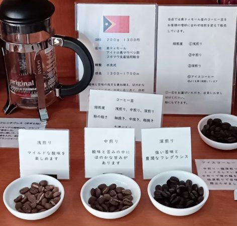 コーヒー好きの私はまよわずコーヒーをチョイス。浅煎りでお願いしました。前回のブログでも紹介しましたが、コーヒーノキの豆はすべて東ティモール産。同じ豆を深煎り・中煎り・浅煎りの3種類にお店で焙煎されています。
