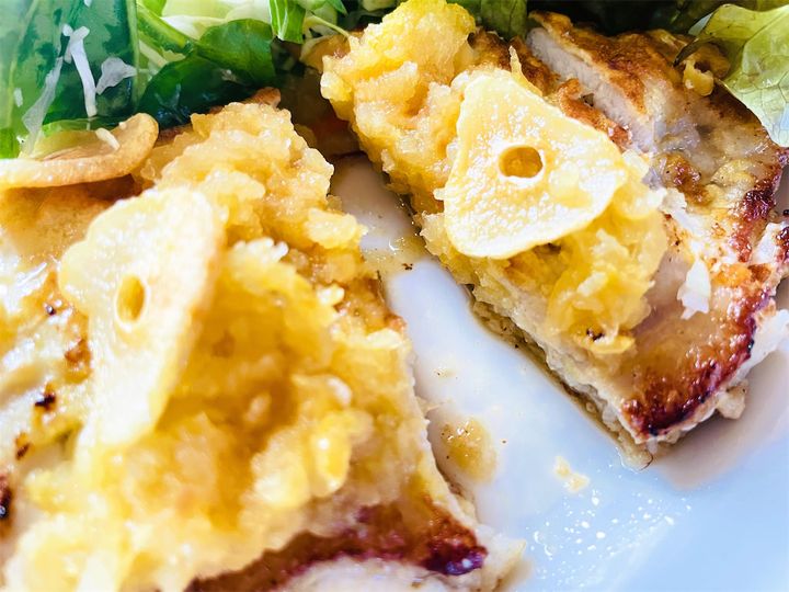 焼きあがった豚肉のピカタに、温かいりんごのソースをたっぷりかけて、完成!