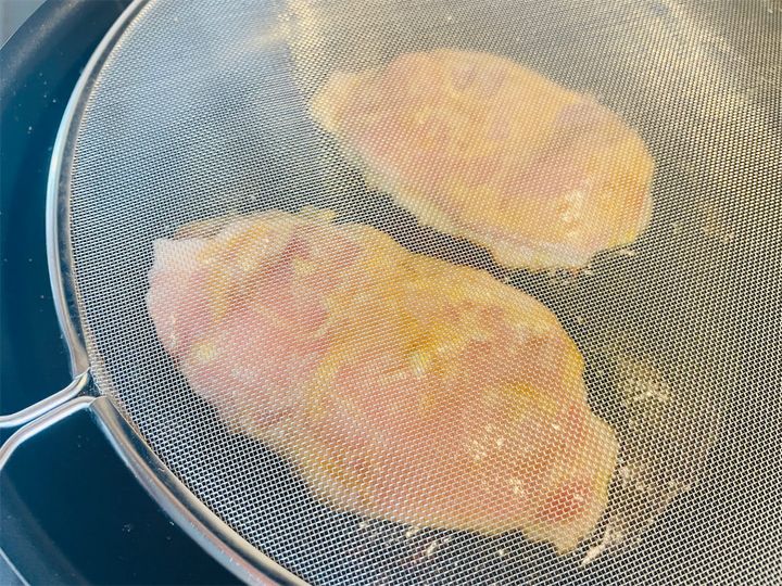 残った溶き卵はもったいないので焼く直前まで豚肉にかけておきました。焼くときに余分な卵液をきると焦げにくいですよ。
