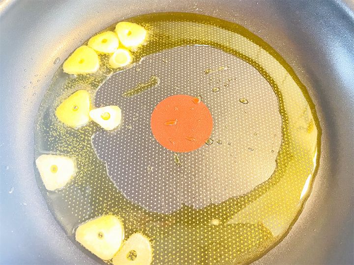 にんにくスライスは弱火でじっくり炒めて油に香りをつけます。きつね色になったにんにくは取り出しておきます。