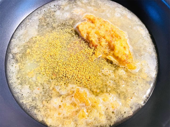 4.フライパンに[A]を入れ、2~3分火にかける。白だしで味をととのえたら、ピカタにかけて完成。