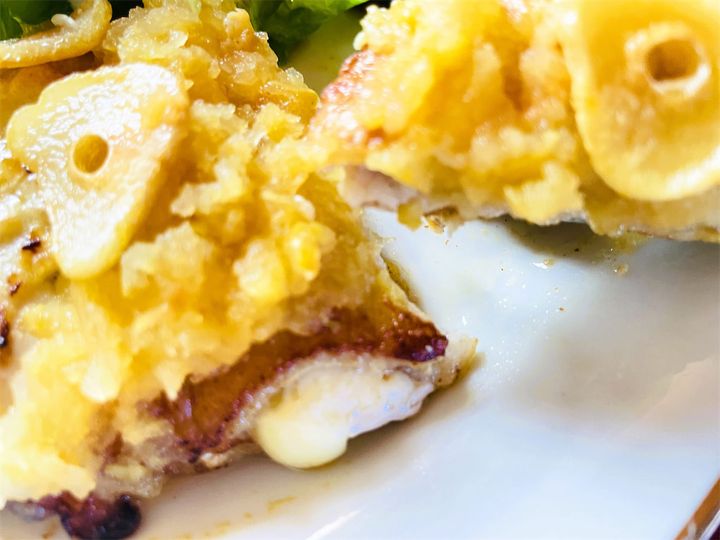 3.フライパンにオリーブオイルとサラダ油をひき、にんにくを弱火で炒める。香りがたったらにんにくを取り出し、2を入れて中火で両面を焼き、皿に盛る。