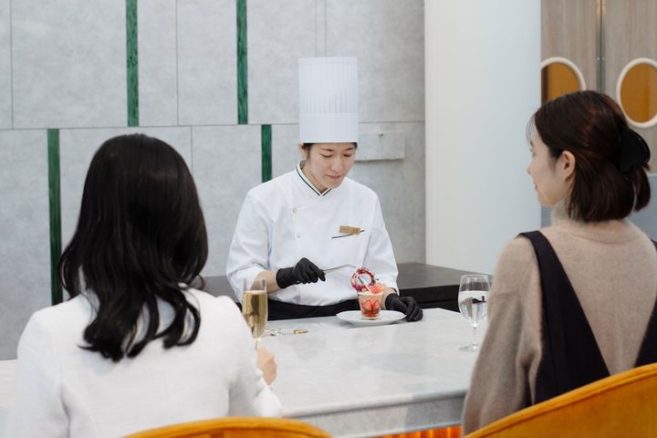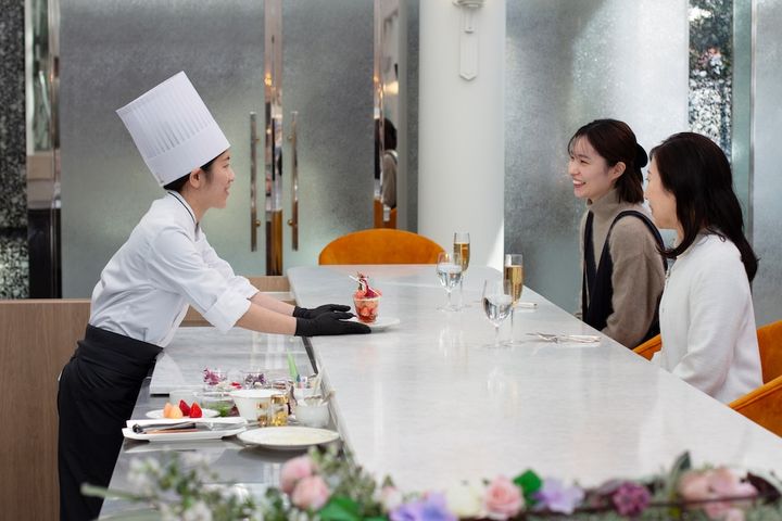 6席限定のシェフズカウンターは、シェフやパティシエールが目の前で仕上げる様子を楽しめる特別な場所。デザートコースでは、アフタヌーンティーやスイーツブッフェとはひと味違う、“可愛い”が生み出される瞬間を目にすることができる。